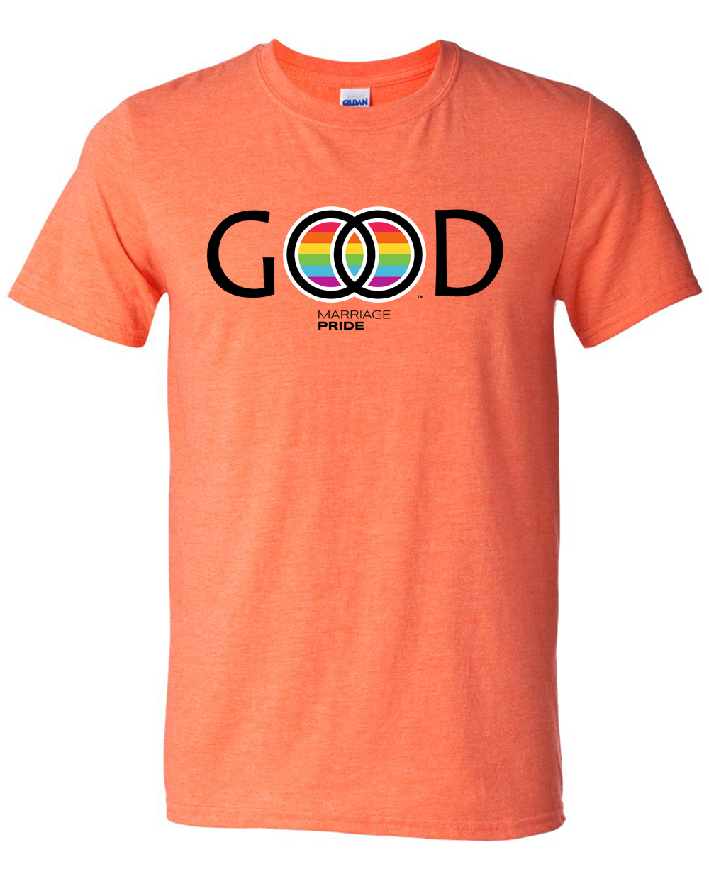 It's GOOD to be married and together You and Yours can feel the VIBRATIONS in this fun and vibrant Marriage Pride GOOD Logo Heather Orange Short Sleeve T-Shirt.